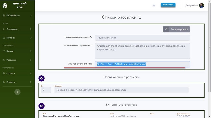Также при просмотре Списка видим поле "Хеш-код списка для API:" с набором символов. Этот хэш-код необходим для работы с API, для автоматического добавления клиентов в Ваше предприятие с различных воронок и парковочных страниц (landing-page), когда клиент оставляет свои контактные данные (например, запись на вебинар или при получении какого-либо подарка,....).